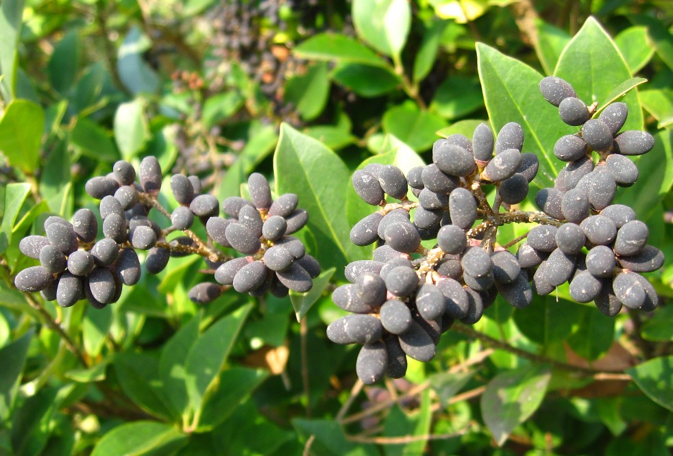 열매는 길이 7~10mm로 10월부터 겨울동안 매달려 있는데 그 생김새가 쥐똥나무 열매와 닮았다.